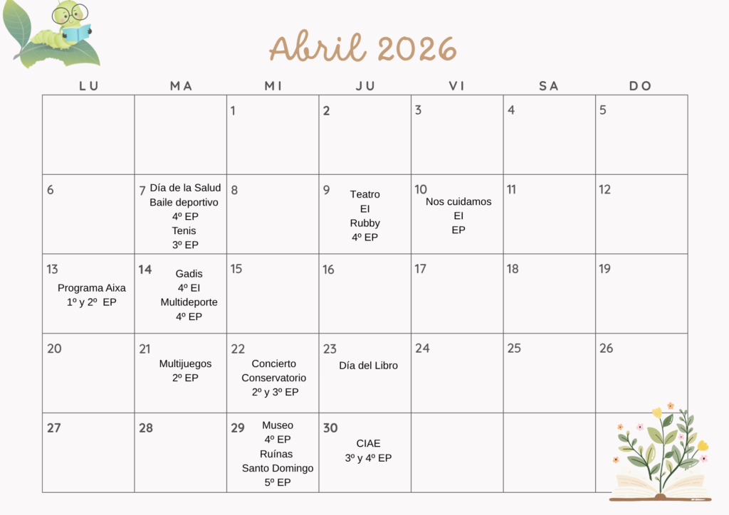 Programación actividades complementarias Sigue nuestras actividades mes a mes, te mantendremos siempre informado/a. Actividades Abril 2026 (PDF) Actividades Marzo 2026 (PDF) Actividades febrero 2026 (PDF) Actividades enero 2026 (PDF)